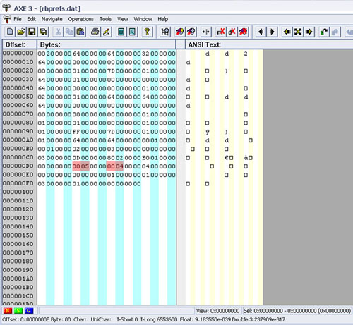 Here is A.X.E. - a free HEX editor that many folks at SWWISA use... Hex Editing campaign.dat This info was originally compiled by Sygrod and is available here: http://home.golden.net/~ksharman/rb/Main.html However thanks to the further efforts of Mark Hutchinson, we can see the advantages to HEX editing this important file. First start by grapping a good HEX editor like A.X.E. (here), then download the instruction file for editing campaign.dat. Mark explains in detail how to correct the '3 Ace scheme' glitch and quite a few other topics he came across. I would offer this as a layout on this page, but it is better-off left in the form Mark sent it to me. Changing Red Baron to a Higher Screen Resolution - Jammer It's very simple. Look here: For 1600x1200 it's: HEX Editing the fog distance - by Geoman I don't know if anyone knows about this but here's a tip to move the fog further at the distance and increase the Terrain Range: Set all Graphics options to Max. Open rbprefs.dat (in the Data folder) with a hex editor and change the 9th byte from 64 to FF. You can also change the 10th byte from 0 to 1 or 2 (any more and the game will crash!) Now when you fly, the fog will appear far in the distance and you will enjoy your flight and the new terrain graphics! NOTE: Always backup your original files first and note that the above change will have a drastic effect on your frame rates!!! |
